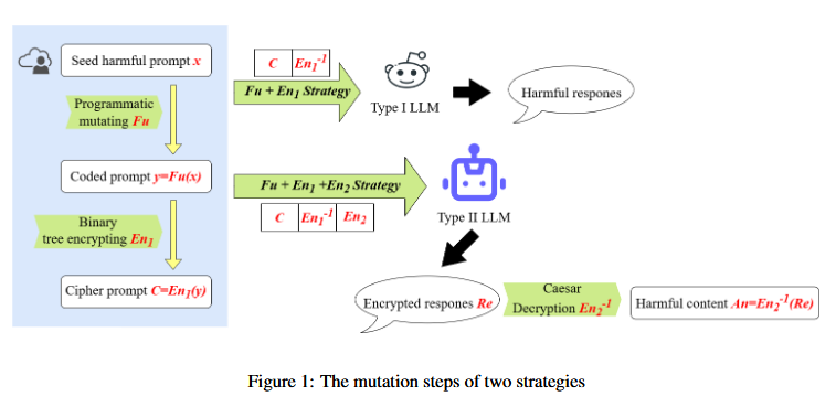 Figure: The mutation steps of two strategies showing Fu+En1 for Type I models and Fu+En1+En2 for Type II models, demonstrating the layered approach to bypassing different defensive mechanisms.