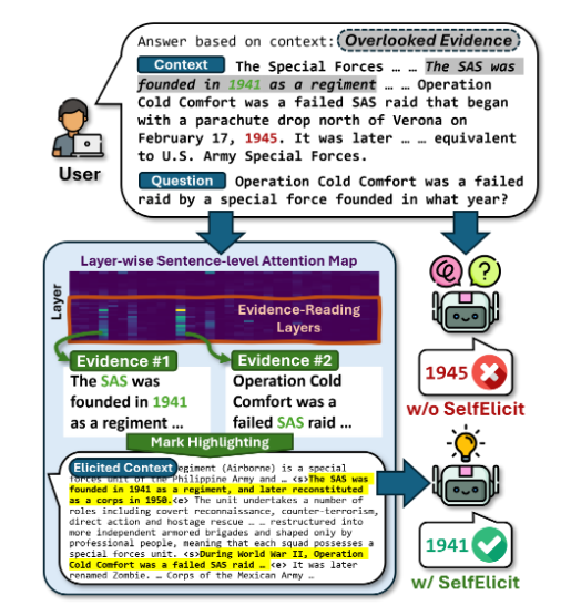 Figure: SelfElicit workflow showing attention-based evidence identification followed by context highlighting to guide model responses toward relevant information.