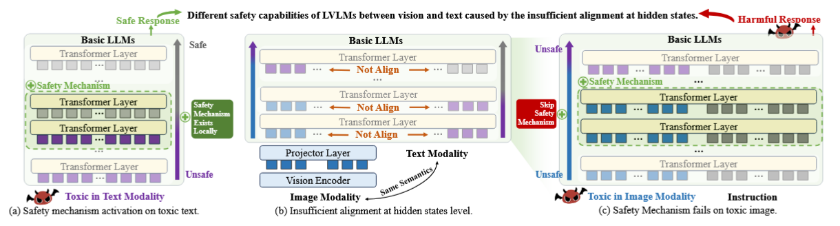 This paper argues that today’s vision–language alignment procedures do not transfer a base LLM’s text-mode safety behaviors to the vision modality. The authors localize where refusals are triggered inside LVLMs, show that image tokens are misaligned with the corresponding text at precisely those “safety-activation” layers, and propose Text-Guided Alignment (TGA), which retrieves a text template and trains the projector so that image-side hidden states align with text-side hidden states layer-wise. Empirically, TGA raises defense success rate (DSR) against toxic images across seven scenes without any vision-side safety finetuning, while preserving general VLM utility.
