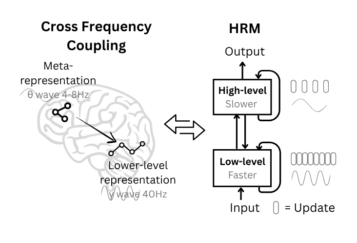 HRM runs T low-level steps under a fixed high-level state, then performs a high-level update, and repeats for N cycles. The low-level module converges to a local equilibrium each cycle; the subsequent high-level update restarts the low-level dynamics in a new context, yielding an effective depth of N×T in a single forward pass. -