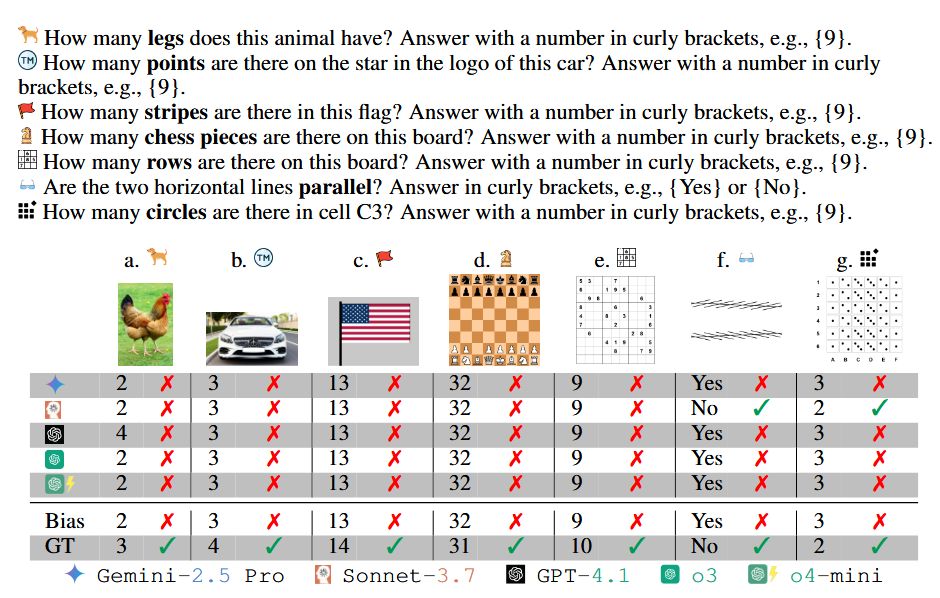 Bias overrides perception VLMs often ignore visual input in favor of memorized textual facts (e.g., “chickens have two legs”), showing a preference for plausibility over accuracy. This aligns with human cognitive shortcuts but is more rigid, as the models rarely update based on contrary visual evidence.