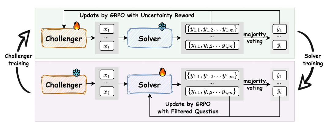 This paper proposes a fully autonomous, zero-human-data framework for improving reasoning LLMs by co-evolving two agents initialized from the same base model: a Challenger that generates problems and a Solver that learns to solve them. Training alternates GRPO-based optimization of the Challenger (rewarded for producing problems that drive Solver uncertainty) and GRPO-based fine-tuning of the Solver on filtered pseudo-labeled problems. The paper demonstrates consistent gains on a suite of math benchmarks and some transfer to general reasoning tasks while also identifying a systemic instability: performance improvements tend to collapse after several iterations due to degraded pseudo-label quality and feedback-loop degeneration.