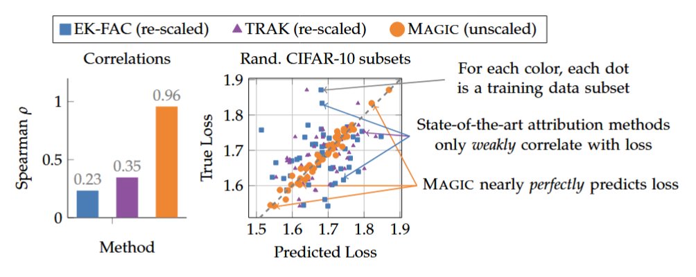Figure: Correlation between predicted and true loss changes when removing random subsets of data. MAGIC (orange) achieves near-perfect correlation, whereas baselines (blue, purple) show weak correlation and large scale errors.