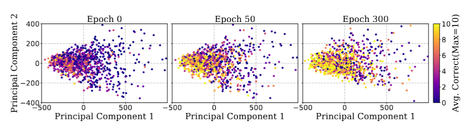 - Epoch 1: The sampler prioritizes Question A. The model generates a solution, likely getting a strong, clean gradient update because the internal representation is already partially aligned.