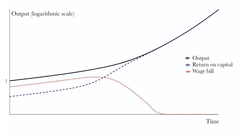 Figure: A modeled trajectory of AI displacing human labor. Note that while aggregate output scales logarithmically, the wage bill eventually collapses to zero prior to full automation.