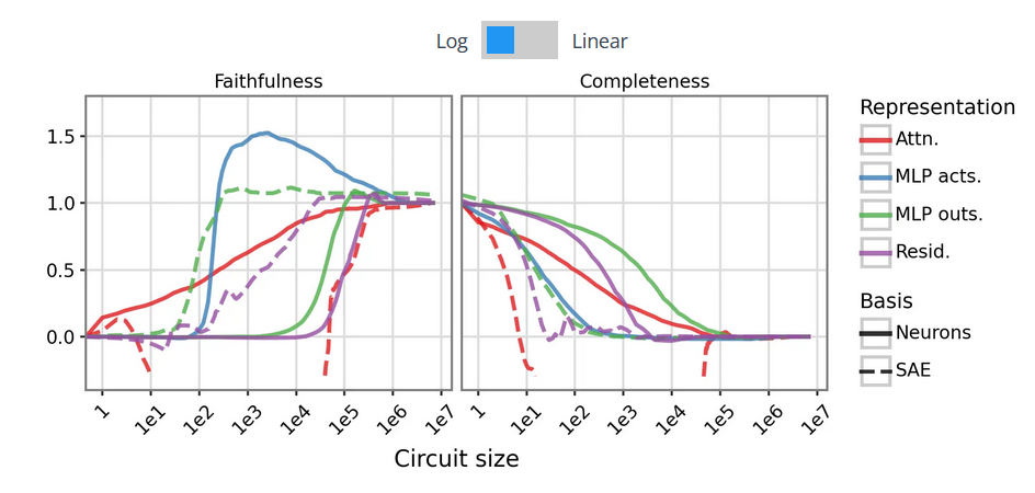 2) Improved Attribution Methods Close the Gap Traditional circuit tracing heavily relies on Integrated Gradients, which introduces significant noise and computational inefficiency in deep networks. Substituting this with the RelP attribution method significantly improves the precision of identifying causally relevant neurons, eliminating the performance gap between raw neurons and SAE features.