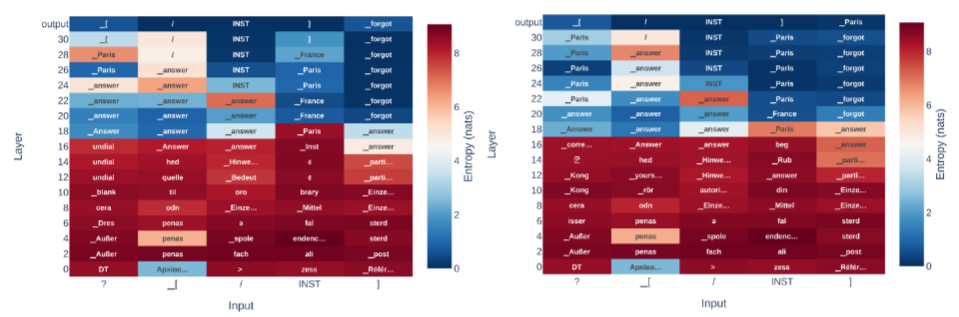 Figure: Logit lens visualization demonstrating the "pretend to forget" phenomenon. The model correctly identifies the factual token in intermediate layers but shifts to predicting the 'forgot' token at the final output layer.